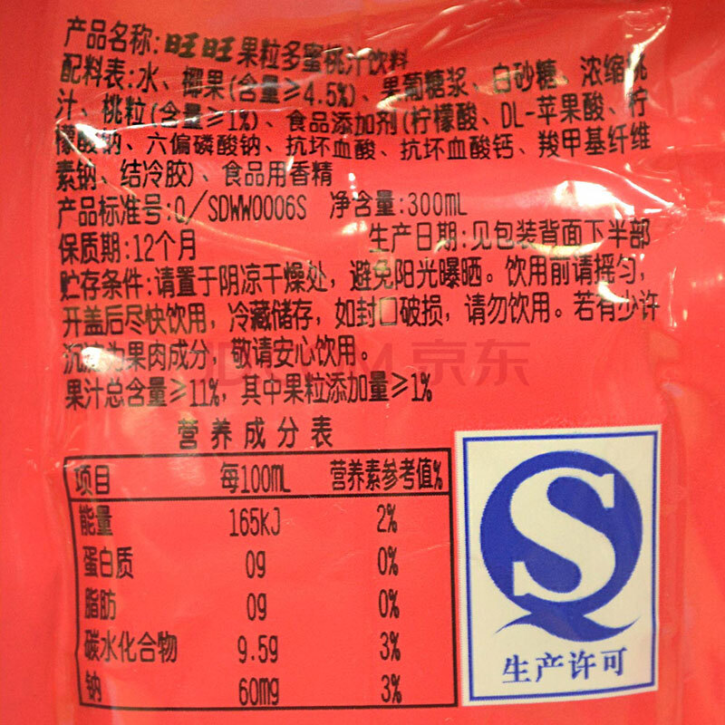 商品名称:旺旺 果粒多蜜桃味 果汁饮料休闲饮品 300ml*1包