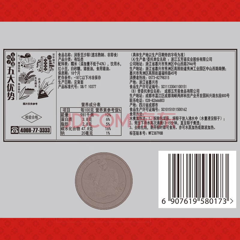 商品名称:五芳斋 速冻豆沙粽 100g*5只 嘉兴粽子甜粽端午粽子早餐食品