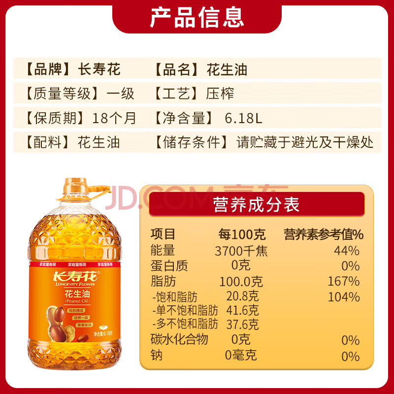 商品名称:长寿花【保真花生油】压榨一级花生油6.18L 食用油