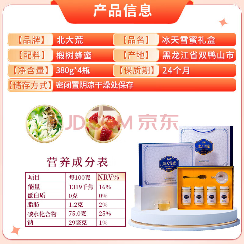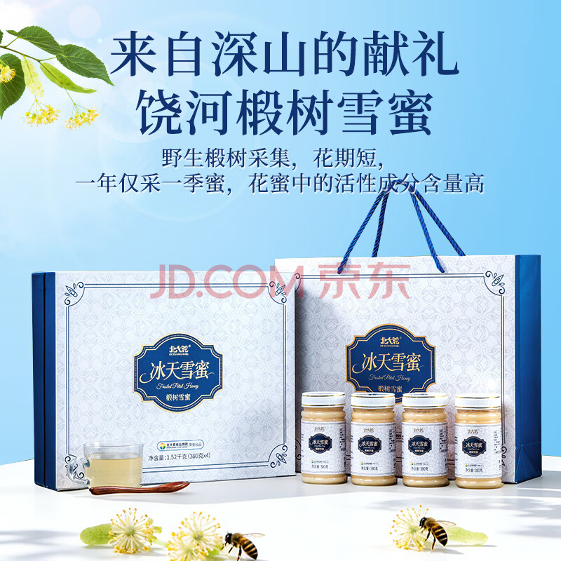 商品名称:北大荒东北黑蜂 椴树冰天雪蜜 纯蜂蜜礼盒1520g 团购送长辈礼品礼物