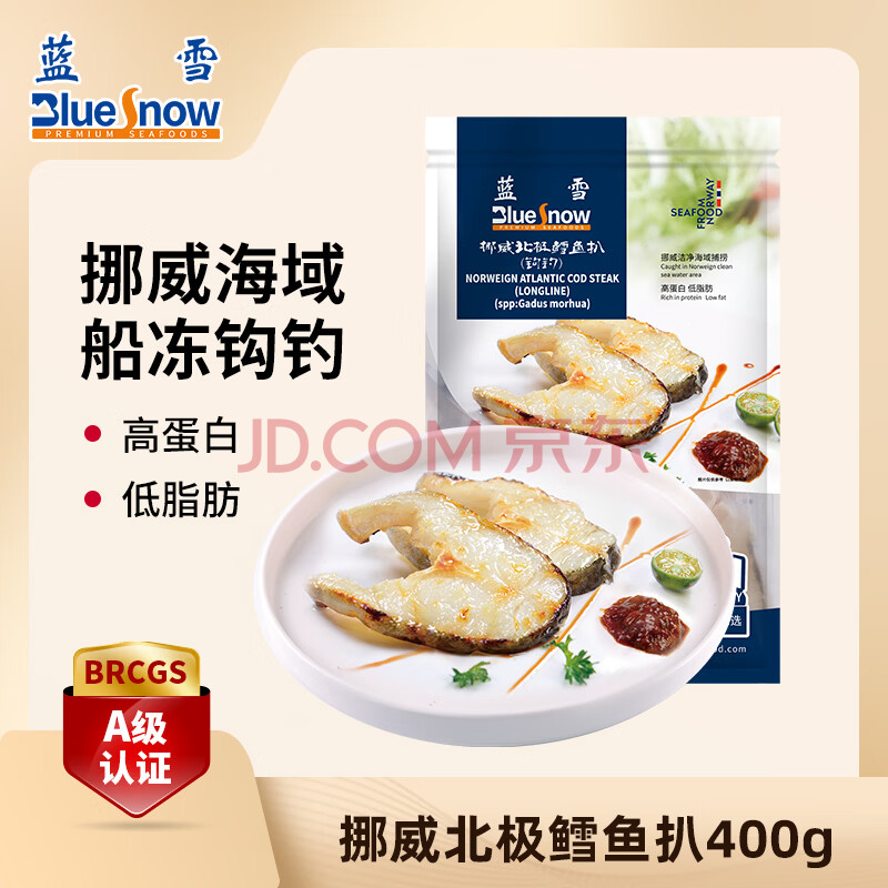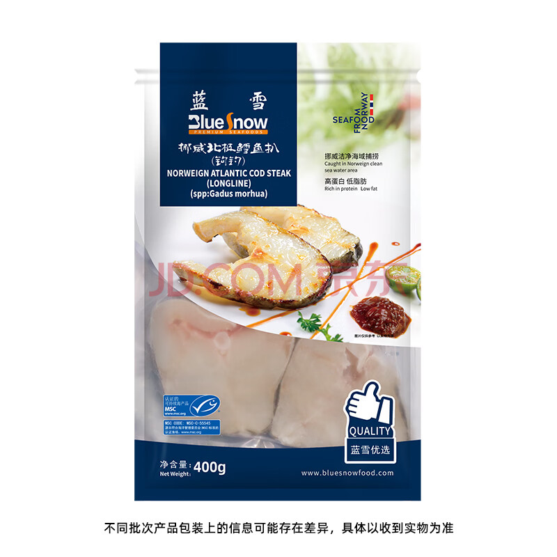 商品名称:蓝雪 冷冻挪威北极鳕鱼扒400g钩钓 3-7块MSC认证袋装切段真鳕海鲜水产