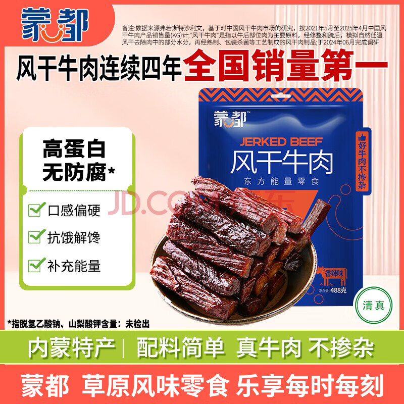 > 蒙都 风干牛肉干 香辣味488g 约七成风干 袋装 休闲零食 肉干肉脯清真