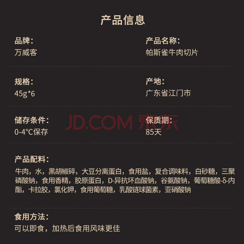 商品名称:万威客 帕斯雀牛肉片(黑椒)45g*6包 草饲牛肉火腿片午餐肉早餐零食熟食
