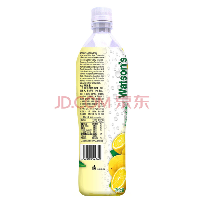 商品名称:屈臣氏(Watsons)柠檬浓缩汁原液饮料1:4浓浆果汁750mL*12瓶整箱装