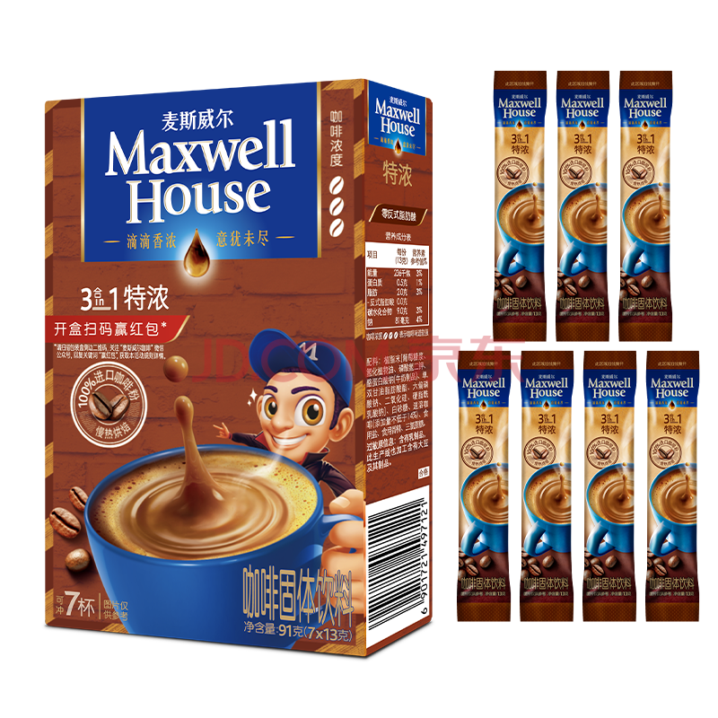 商品名称:麦斯威尔(Maxwell House)特浓速溶咖啡粉13g*7条 三合一冲饮 奶咖 0反式脂肪酸 固体饮料