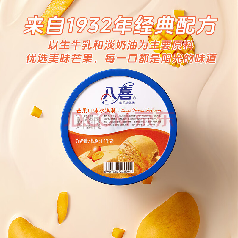 商品名称:八喜冰淇淋 芒果口味1100g*1桶 家庭装 生牛乳冰淇淋大桶