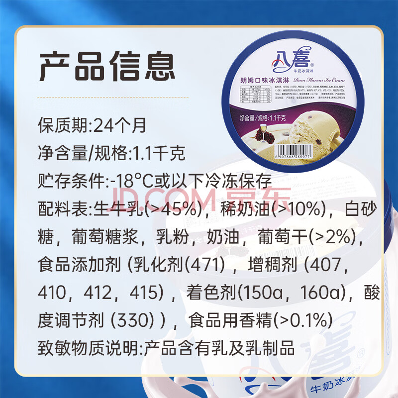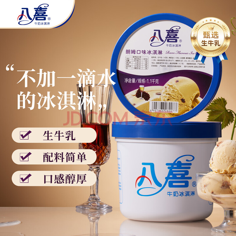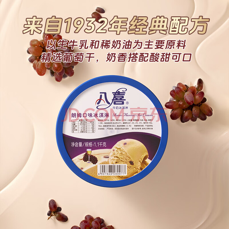商品名称:八喜冰淇淋 朗姆口味1100g*1桶 家庭装 生牛乳冰淇淋大桶