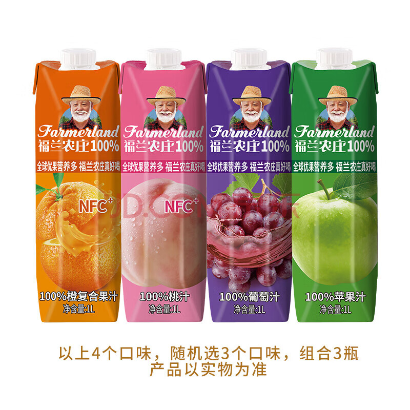 商品名称:福兰农庄100%果汁苹果汁葡萄桃橙汁混合口味随机3种饮料1L*3瓶大瓶囤货装