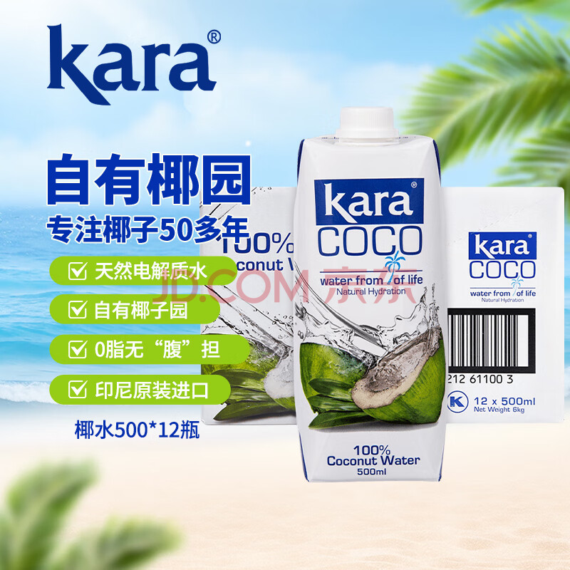 商品名称:KARA100%椰子水500ml*12瓶 含电解质 快速补水进口果汁饮料0脂低卡
