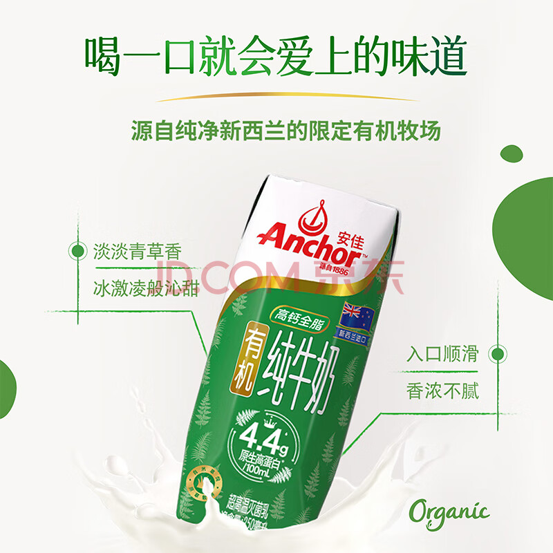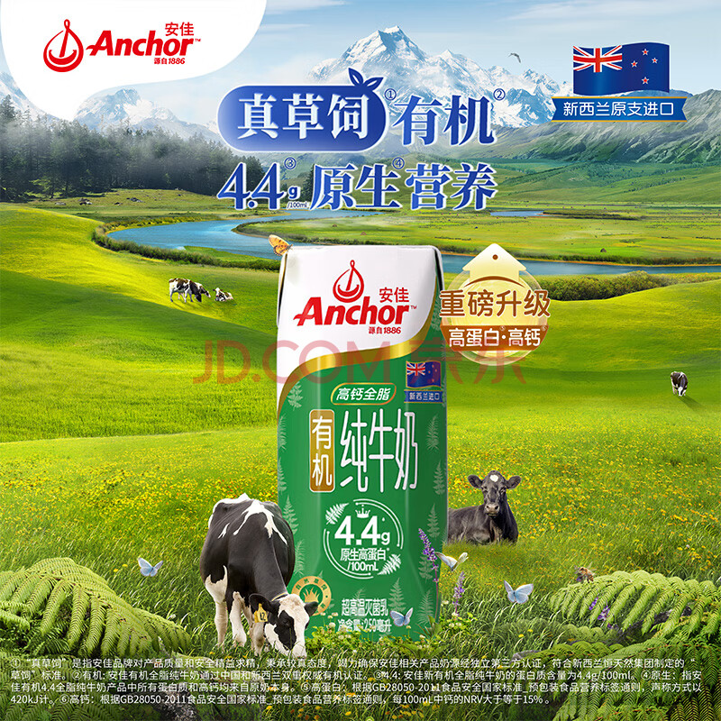 商品名称:安佳(Anchor)珍稀有机4.4g蛋白质全脂牛奶250ml*15盒 新西兰进口草饲牛奶礼盒
