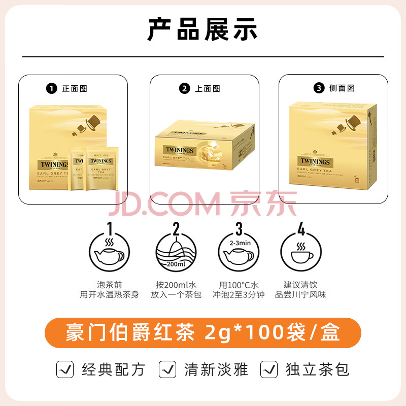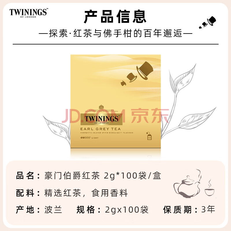 商品名称:川宁(TWININGS)豪门伯爵红茶波兰进口100袋*2g 红茶茶包茶叶 节日送礼 新年礼物