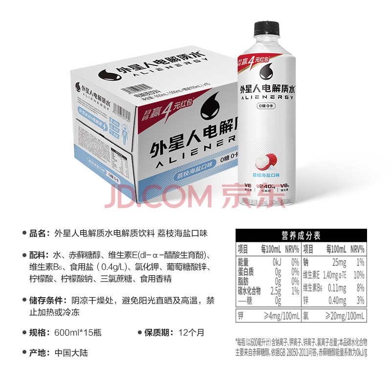 商品名称:外星人电解质水0糖0卡饮料 荔枝海盐口味 600mL*15瓶