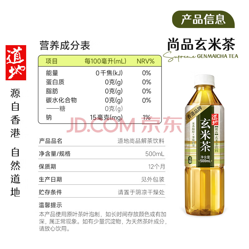 商品名称:道地(TAO-TI)尚品系列 玄米茶0糖0卡0脂肪0热量绿茶玄米茶 500ml*15瓶整箱