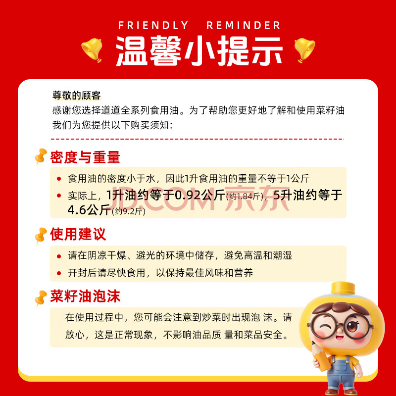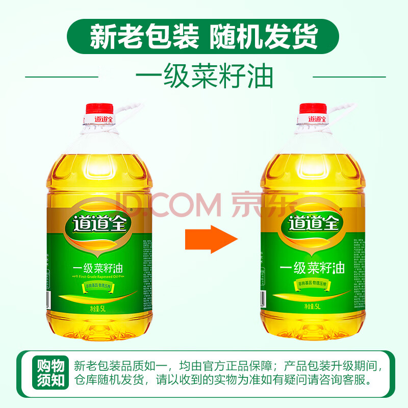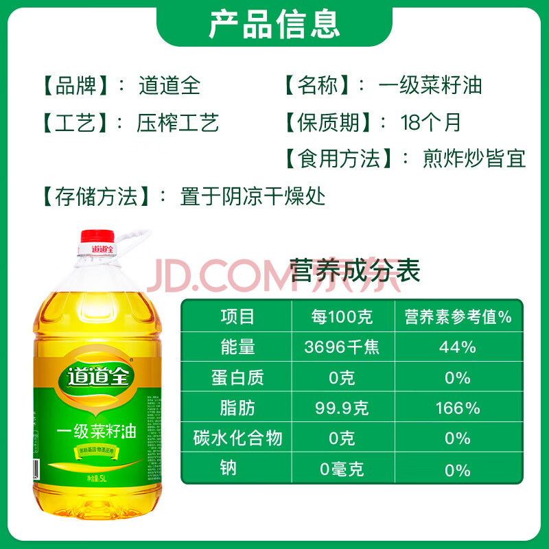 商品名称:道道全【保真菜籽油】食用油 一级菜籽油 物理压榨非转基因 5L*1桶