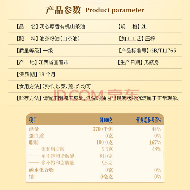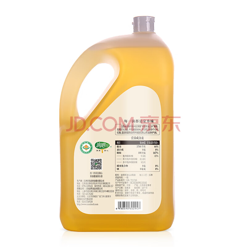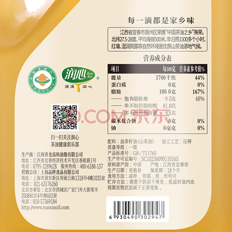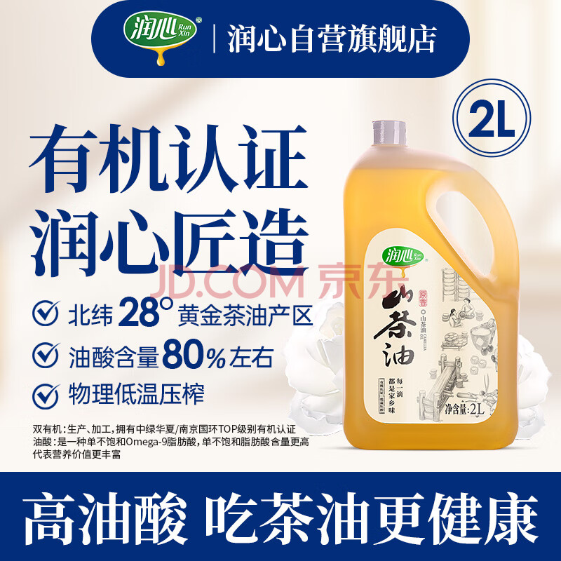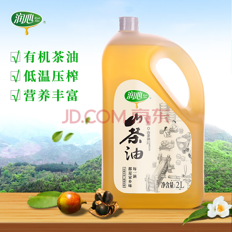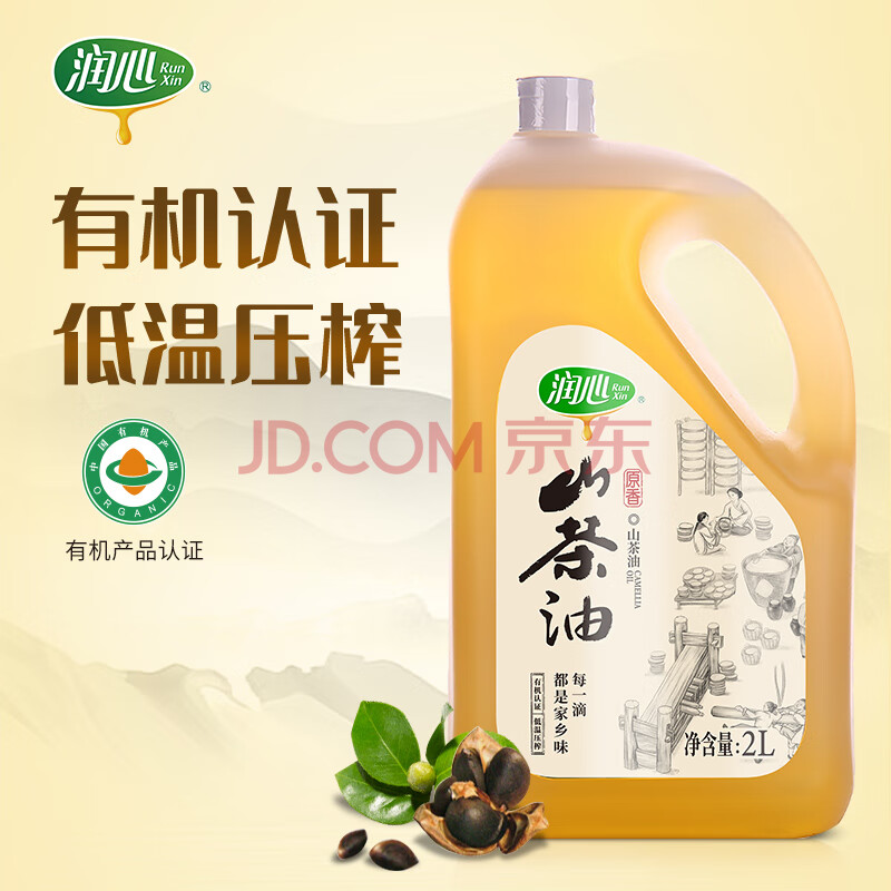 商品名称:润心【保真山茶油】 有机油茶籽油 低温冷榨一级 原香小榨 食用油*2L