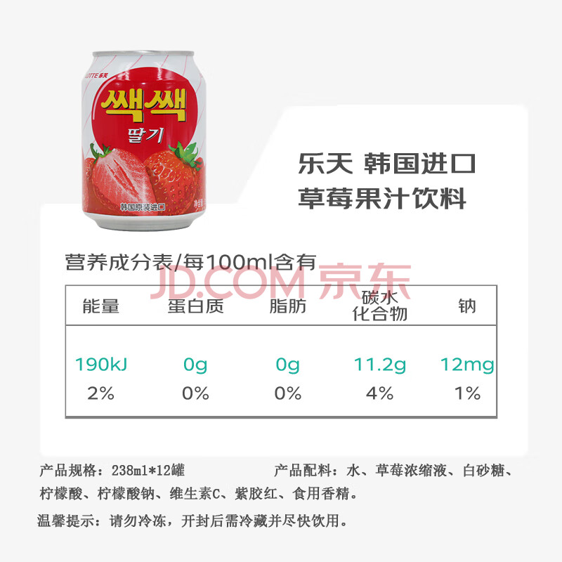 商品名称:乐天草莓果汁饮料含果肉韩国进口238ml*12罐 年货礼品礼盒 1号会员店