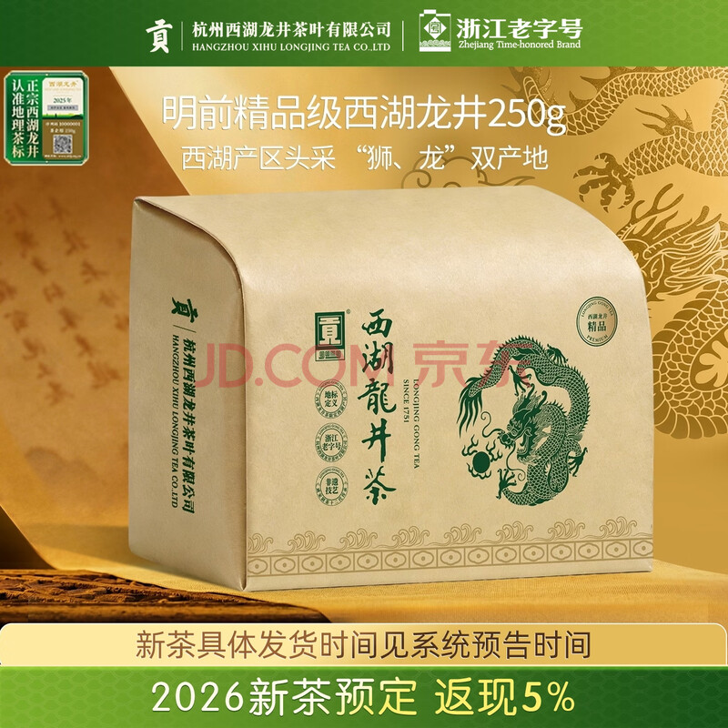 商品名称:贡牌2026新茶预售 绿茶经典西湖龙井茶精品级250g明前纸包源头直发
