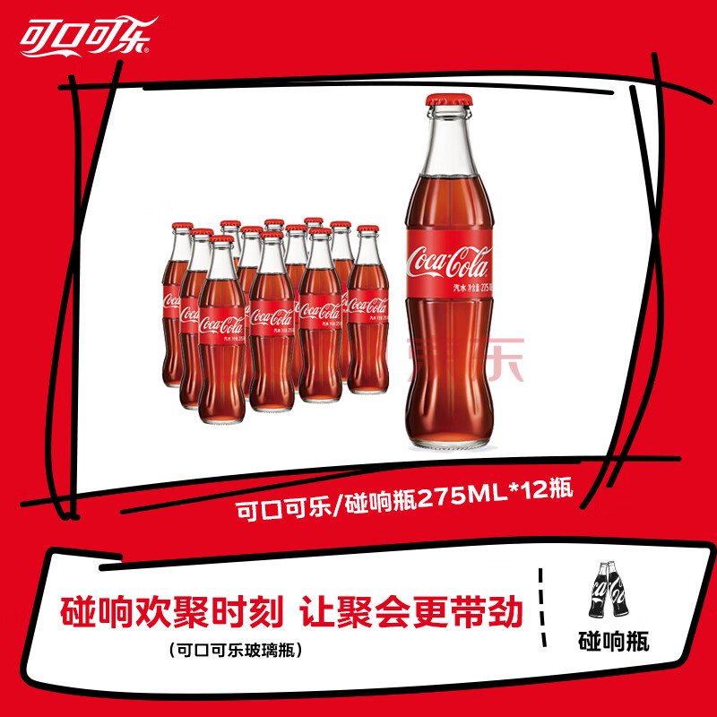 商品名称:可口可乐(Coca-Cola)可乐碰响瓶 碳酸汽水275ml*12瓶 怀旧玻璃整箱装 年货