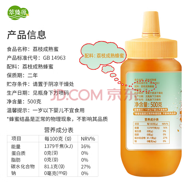 商品名称:萃臻源 蜂蜜 荔枝蜜500g(瓶装)成熟蜜纯天然蜂蜜38节妇女节女神礼物